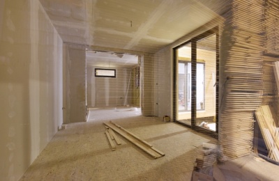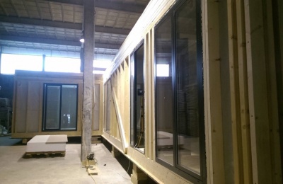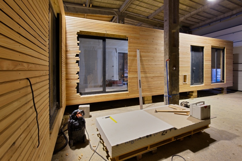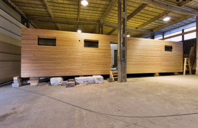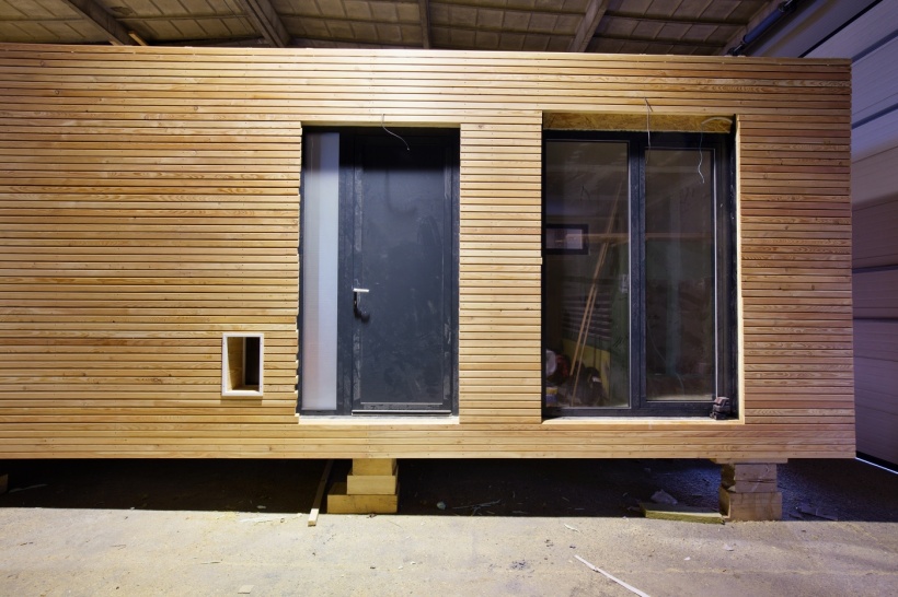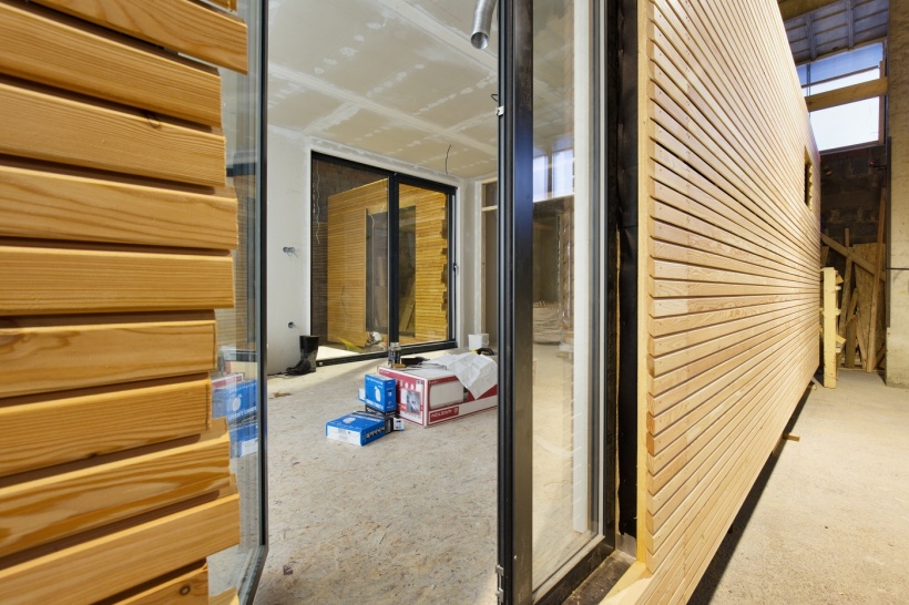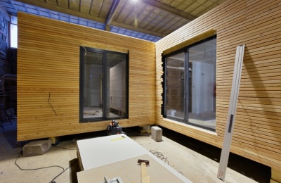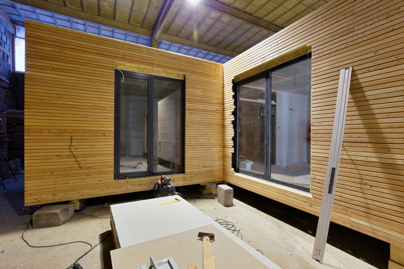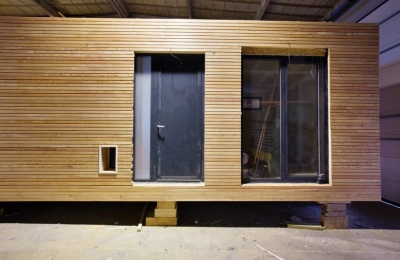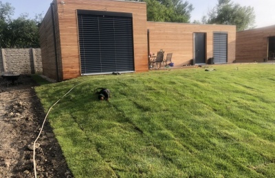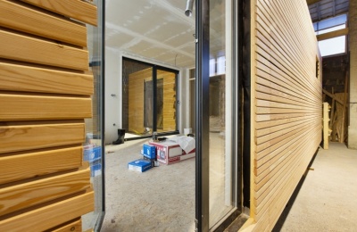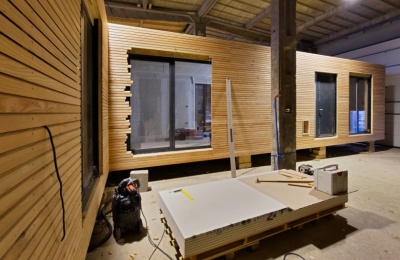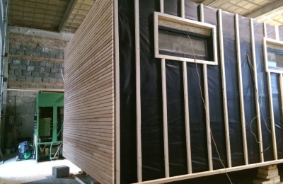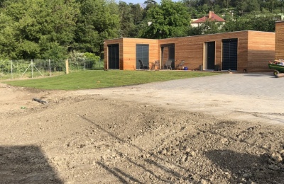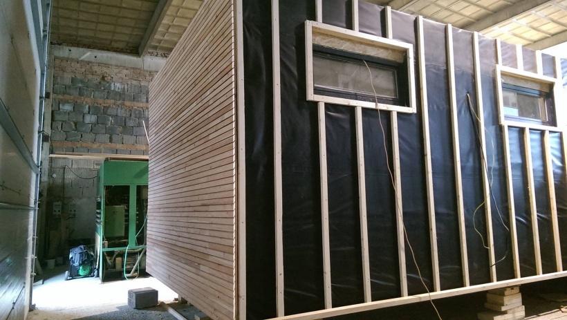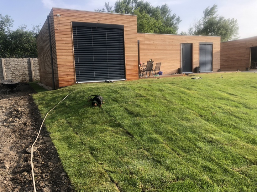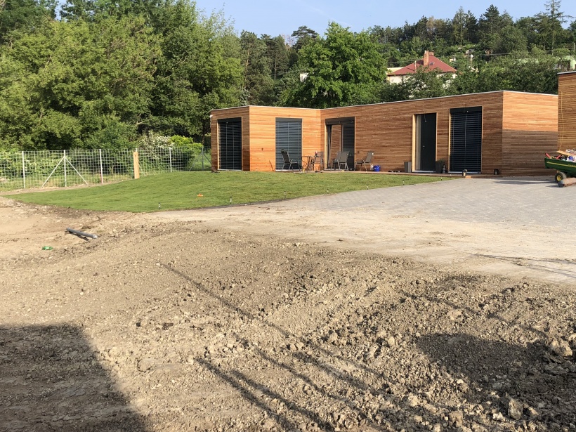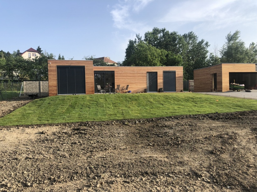 Modulární výstavba Design 15+ do tvaru L velikosti 15 x 4,2 metru a přístavba 3,8 x 4,2 metru. Tyto 2 části domu byly propojeny na místě pokládky. Dům je doplněn o klimatizaci, podlahové vytápění pomocí uhlíkových folií a venkovní předokení žaluzie. Vnitřní část L je doplněna o terasu. Celá kompozice je obložena pomocí modřínového rhombusu a doplněna velkými fransouzskými okny. Videa z pokládek našich domů můžete nalézt na našem Youtube channelu Hutchhouse.
