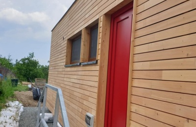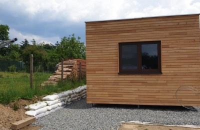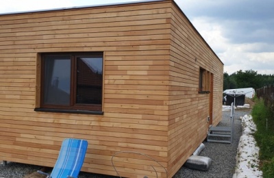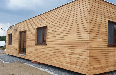 Modulární dům Design o velikost 13 x 4,2 metru. Tento domek je řešen na klíč, kdy si zákazník vybral koupelnu dle svého přání. Celá kompozice je obložena pomocí modřínového rhombusu a doplněna velkým francouzským oknem. Dispozice domu byla upravena na přání zákazníka. Videa z pokládek našich domů můžete nalézt na našem Youtube channelu Hutchhouse.