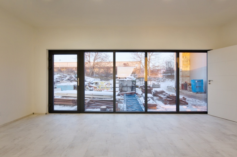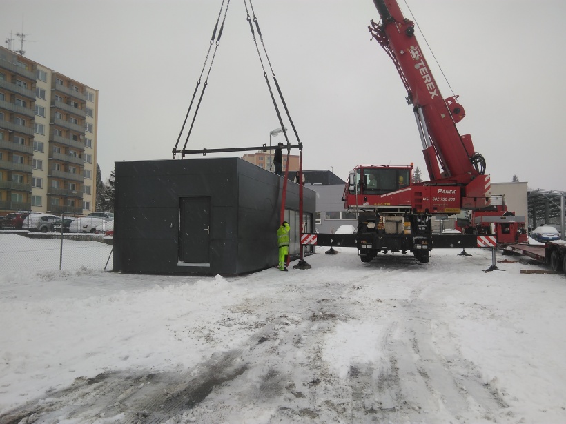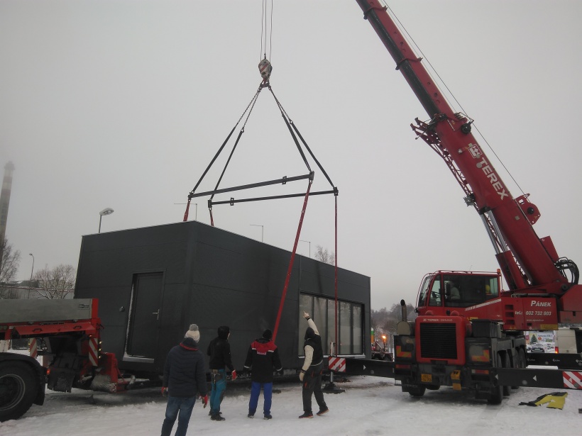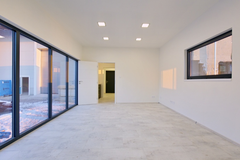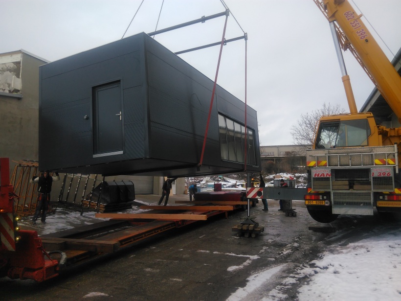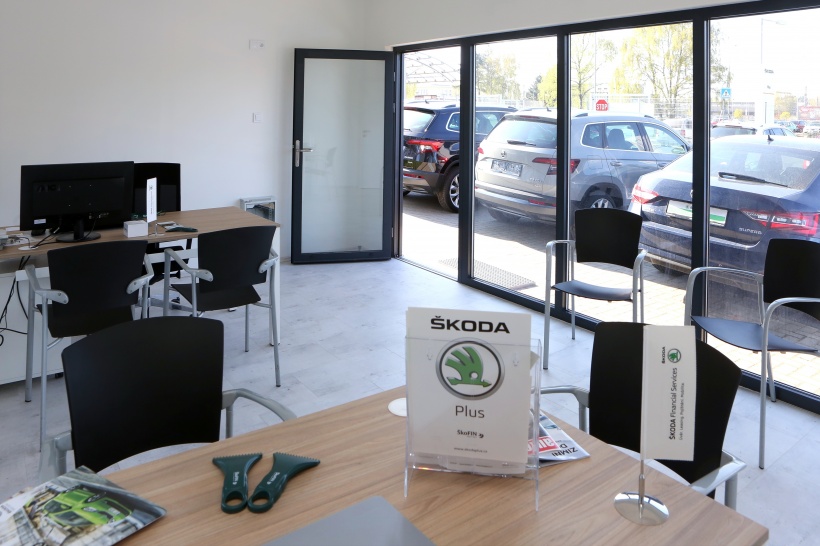 Interiér modulové kanceláře pro ŠKODA Plus. Vnitřní dispozice jsou řešeny na přání zákazníka. Videa z pokládek našich domů můžete nalézt na našem Youtube channelu Hutchhouse.