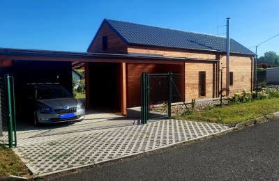 Modulární dům rozšířen na velikost 13,5 x 4,5 metru a doplněn o zádveří velikosti 3 x 1,6 metru. Tento domek je řešen na klíč, kdy si zákazník vybral koupelnu dle svého přání, pro kuchyni poslal podrobný zákres. Celá kompozice je řešena modřínovým rhombusem. Domek je doplněn velkým PSK portálem, což zaručuje dostatek denního světla v obývacím prostoru s kuchyní, kde je řešeno i elektrické podlahové vytápění. Domek navíc obsahuje i nerezový komín pro napojení na krbová kamna. Atipickým prvkem je zde sedlová střecha, která je řešena pomocí trámů a je usazena na vyvýšeném obvodovém rámu, takže do budoucna je zde možnost dalšího rozšířešní stavby. Videa z pokládek našich domů můžete nalézt na našem Youtube channelu Hutchhouse.