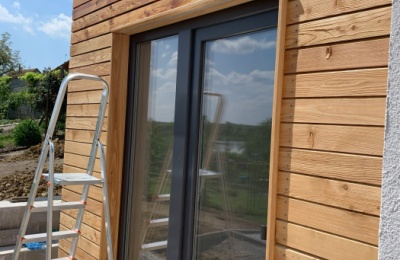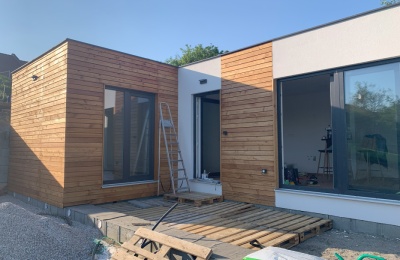 Modulární výstavba Design 11 + do tvaru L velikosti 11 x 4 metry a 4 x 3 metry. Tyto 2 části domu byly propojeny na místě pokládky. Dům je doplněn o elektrické konvektory, posuvné dveře do pouzdra a vybavenou koupelnu. Celá kompozice je tvořena pomocí točené omítky v kombinaci s modřínovým rhombusem a doplněna velkými fransouzskými okny. Okna jsou doplněna o venkovní zabudované led světla. Videa z pokládek našich domů můžete nalézt na našem Youtube channelu Hutchhouse.