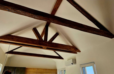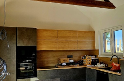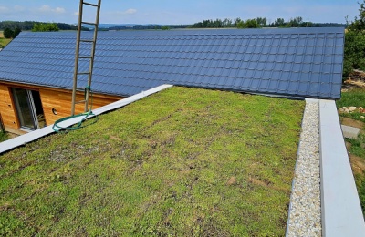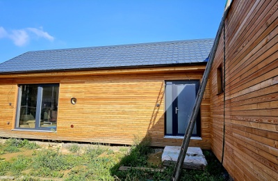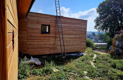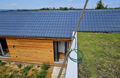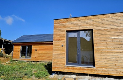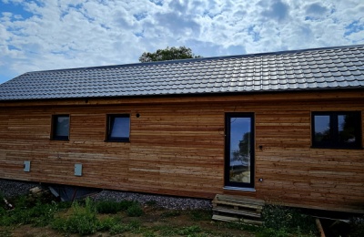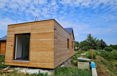 Modulární sestava Design L 15 + tvořena ze dvou modulů velikosti 15 x 4,3 metru a 6,8 x 4,5 metru. Tyto 2 části domu byly propojeny na místě pokládky. Dům je doplněn o podlahové vytápění pomocí uhlíkových folií, tepelné čerpadlo vzduch / vzduch, boiler na bázi tepelného čerpadla pro ohřev TUV a nerezový komín vč krbových kamen. Celá kompozice je tvořena pomocí modřínového rhombusu a doplněna velkými fransouzskými okny. Vzhled doplňuje sedlová střecha s přesahy, kdy jsou celkově užity 3 typy střechy. Klasická sedlová střecha z vazníků, sedlová tzv. "trámová" střecha, která tvoří otevřený prostor v obývací části s kuchyní a atiková střecha, která je doplněna o zelenou vegetaci. Videa z pokládek našich domů můžete nalézt na našem Youtube channelu Hutchhouse.