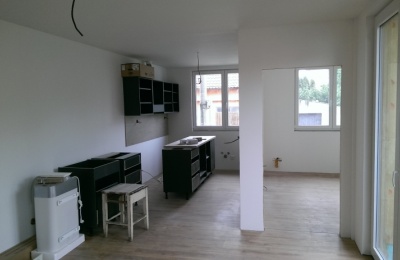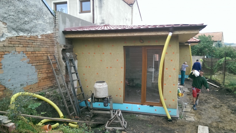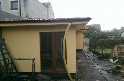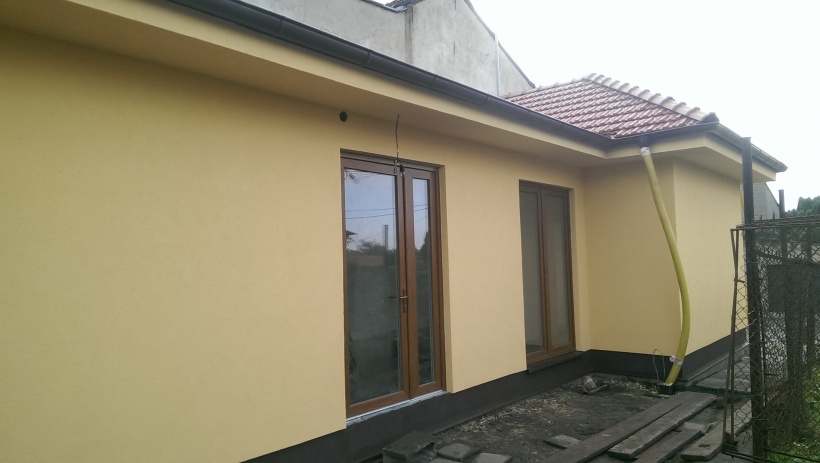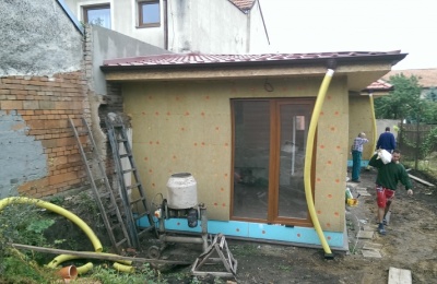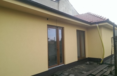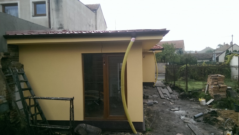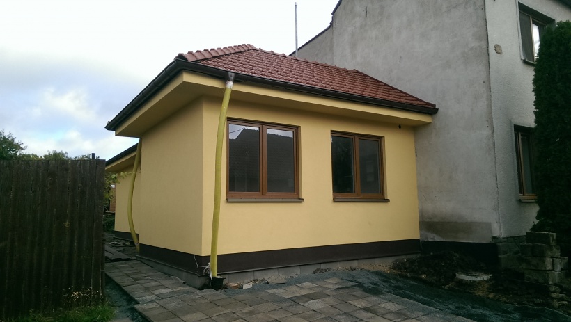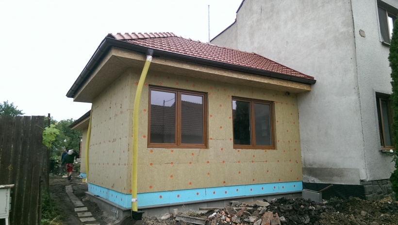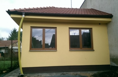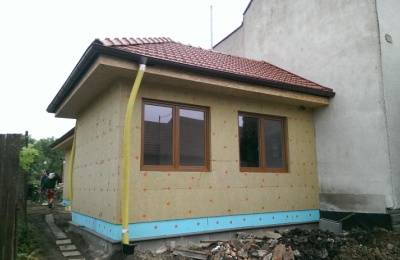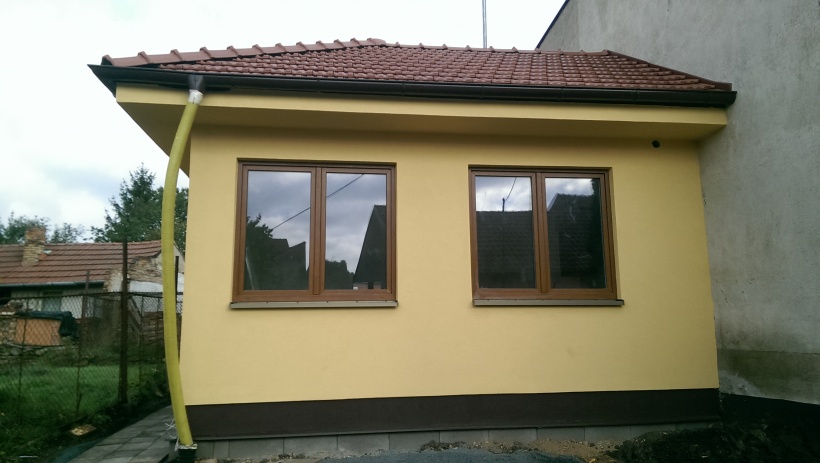 Dokončená soustava domů do L, velikosti 10 x 4,2 metrů a 6 x 4,2 metrů v Praci u Brna. Na této stavbě byla zvolena klasická silikonová omítkak a střešní krytina z pálených tašek. Videa z pokládek našich domů můžete nalézt na našem Youtube channelu Hutchhouse.