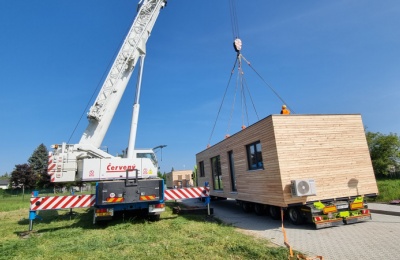 Modulární dvojdomek velikosti 13 x 4,2 metru, rozšířen o stříšku a terasu. Tyto domky byly stavěny samostatně jako jednotlivé moduly, takže jsou neprůchozí, na místě se utvořilo jen propojení střechy. Dům je doplněn o tepelné čerpadlo vzduch/vzduch s funkcí klimatizace a vytápění. Domy mají také již zabudovaný kuchyňský kout. Celá kompozice je obložena pomocí modřínového rhombusu a doplněna velkými francouzskými okny. Videa z pokládek našich domů můžete nalézt na našem Youtube channelu Hutchhouse.