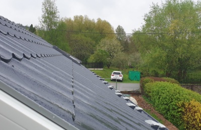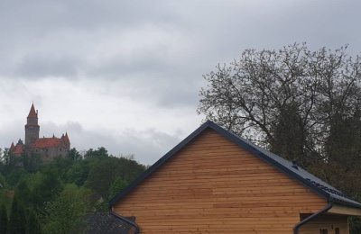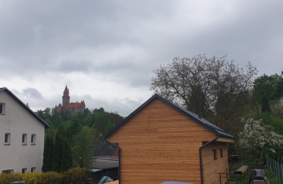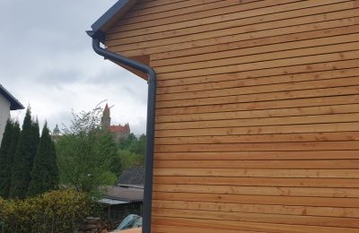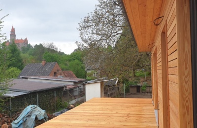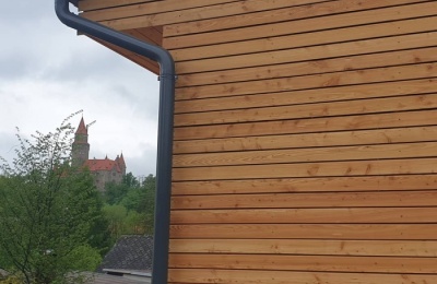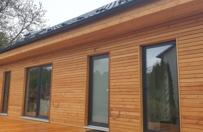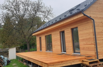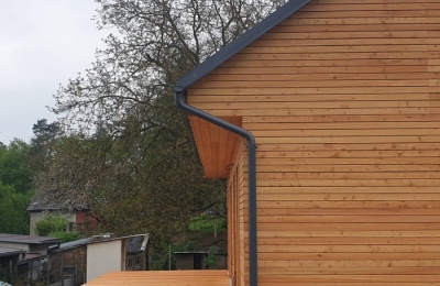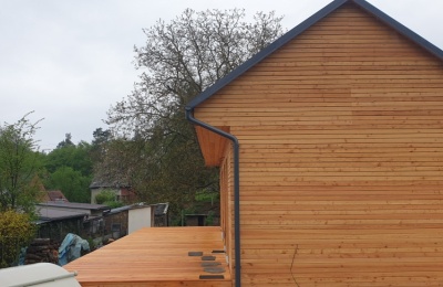 Modulární dům velikosti 13 x 4,2 metru, který byl rozšířen o terasu. Domek je specifický tím, že má vyvýšenou střechu tvořenou z trámové konstrukce, což umožňujej obytné podkroví. Tento domek byl stavěn u nás ve výrobně a následně byl převážen na místo určení, kde byla dodělána střecha. Celá kompozice je obložena pomocí modřínového rhombusu a doplněna velkými francouzskými okny. Videa z pokládek našich domů můžete nalézt na našem Youtube channelu Hutchhouse.