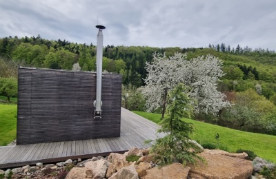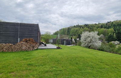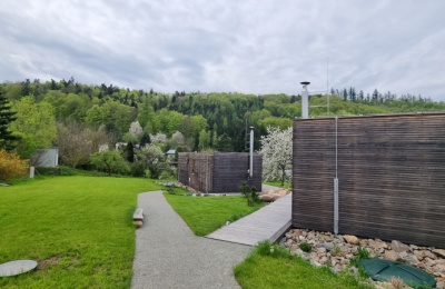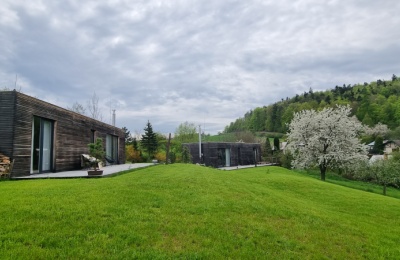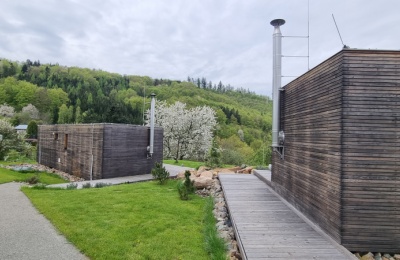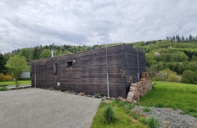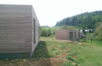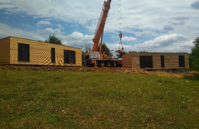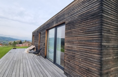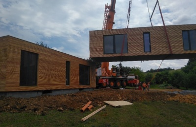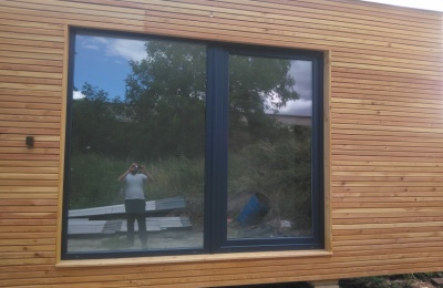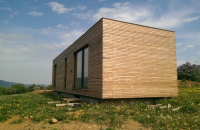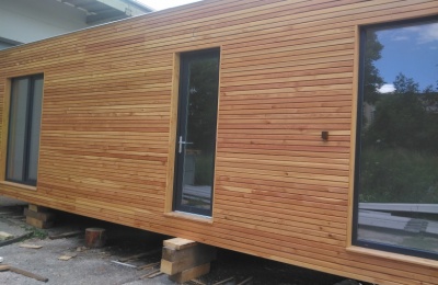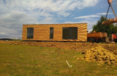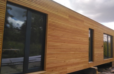 Modulární dům velikosti 12 x 4,2 metru, dodávka 2 domků. Celá kompozice je obložena pomocí modřínového rhombusu a doplněna velkými francouzskými okny.