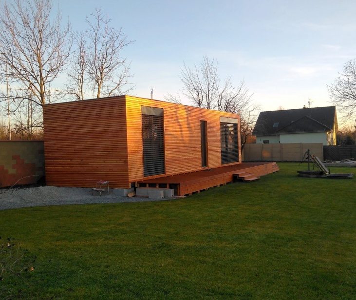 Dokončený zahradní domek velikosti 12 x 4,2 metrů v Praze Kunraticích. Jde zde již vidět dokončená terasa, namontovaný nerezový komín a elektronické žaluzie, které celému domu dodávají moderní design. Videa z pokládek našich domů můžete nalézt na našem Youtube channelu Hutchhouse.
